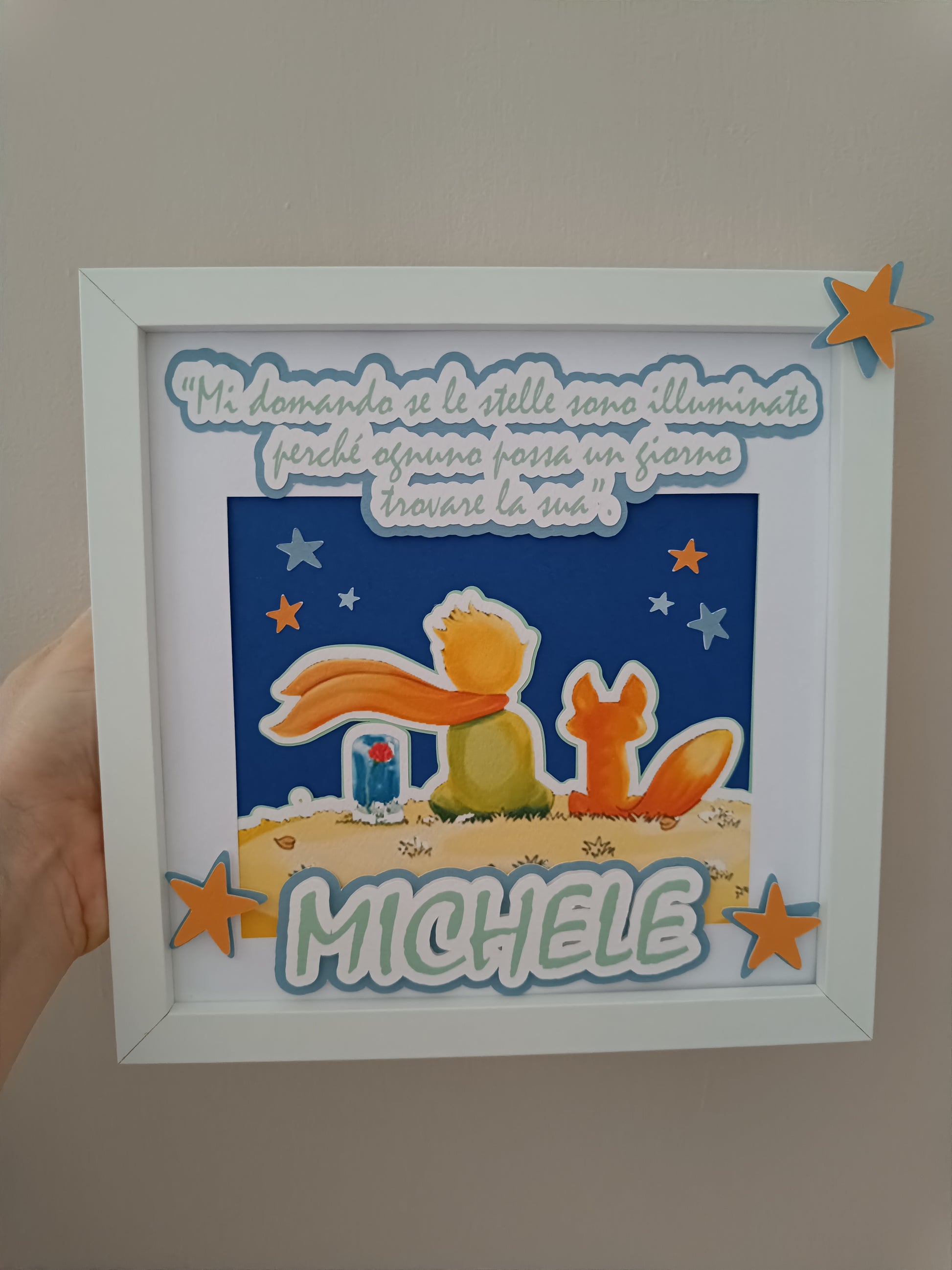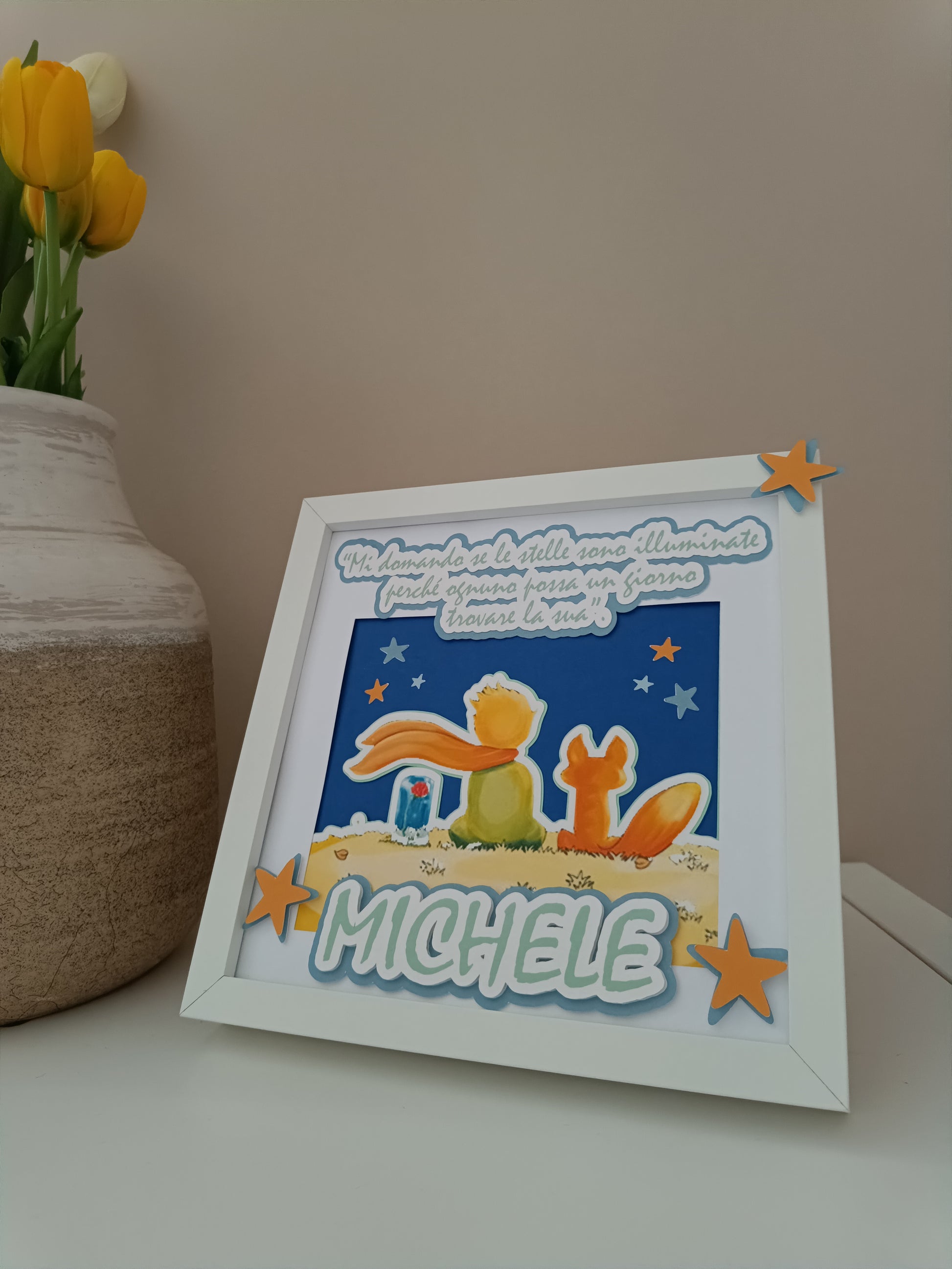 Con delicatezza e cura, il design richiama il mondo fiabesco del celebre racconto: la silhouette del piccolo principe che osserva il cielo, circondato da dettagli ispirati ai pianeti e alle stelle, rende questa cornice unica e magica. Il nome personalizzato aggiunge un tocco esclusivo, trasformando questa cornice in un ricordo prezioso.