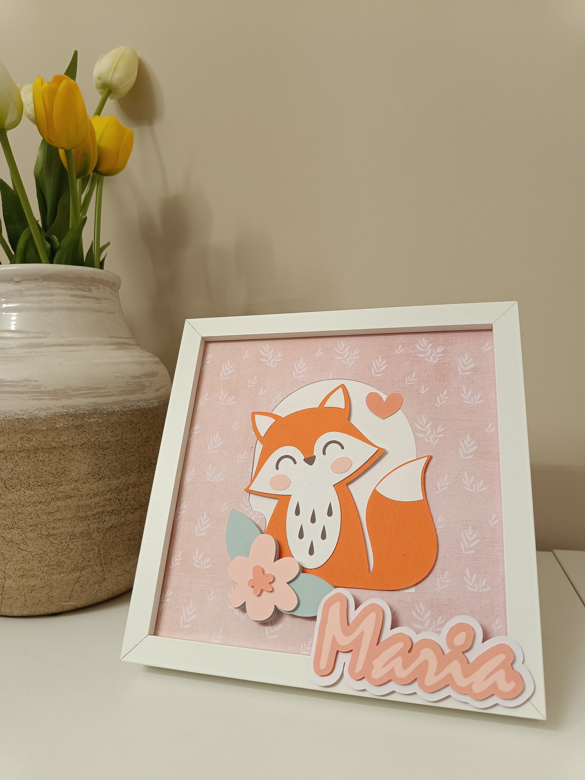 Questa cornice decorata con carta intagliata è un pezzo unico ed originale. Al centro, una simpatica volpe, intagliata con precisione, aggiunge un tocco fiabesco e originale alla composizione. Il nome personalizzato si armonizza perfettamente con il design, creando un effetto raffinato e tridimensionale. Ogni dettaglio è realizzato con estrema cura, dando vita a un'opera delicata ma d’impatto.