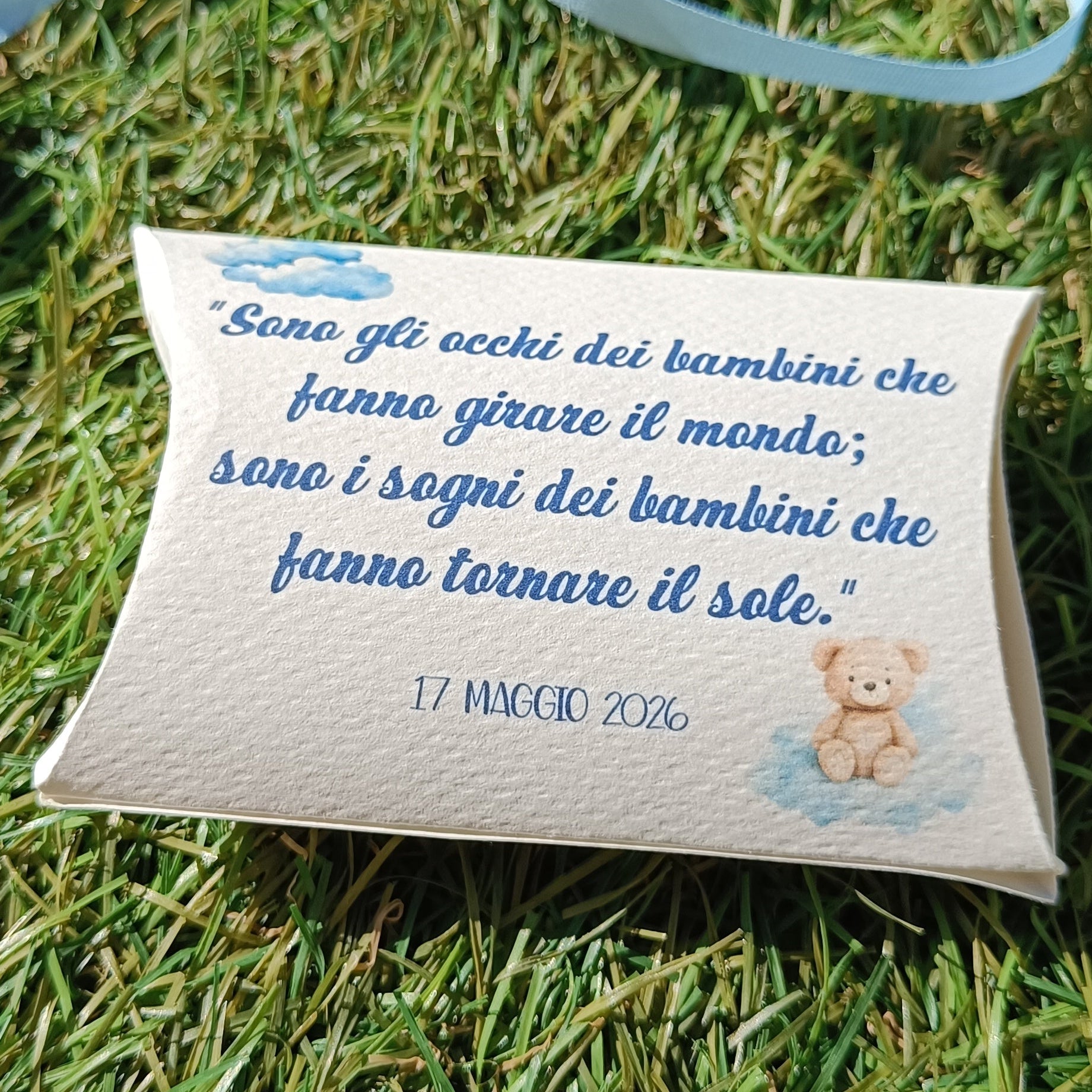 La scatolina cuscino con confetti è un'idea elegante e originale per celebrare momenti speciali. Con la sua forma morbida e avvolgente a cuscino, questa scatolina aggiunge un tocco di raffinatezza a nascita, battesimi, comunioni, matrimoni e altri eventi. Realizzata a mano in cartoncino, può essere personalizzata con la grafica che più si addice al tema scelto per il vostro evento ed eventuali nastrini e/o tag, per un effetto unico e sofisticato. Al suo interno, troverete confetti a scelta tra mandorla o cioccolato.