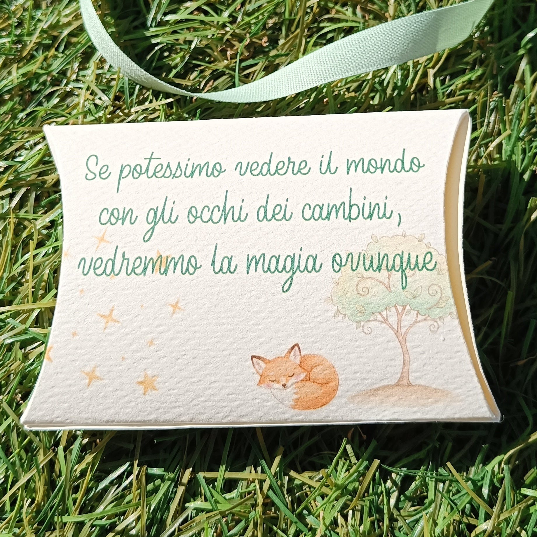 La scatolina cuscino con confetti è un'idea elegante e originale per celebrare momenti speciali. Con la sua forma morbida e avvolgente a cuscino, questa scatolina aggiunge un tocco di raffinatezza a nascita, battesimi, comunioni, matrimoni e altri eventi. Realizzata a mano in cartoncino, può essere personalizzata con la grafica che più si addice al tema scelto per il vostro evento ed eventuali nastrini e/o tag, per un effetto unico e sofisticato. Al suo interno, troverete confetti a scelta tra mandorla o cioccolato.