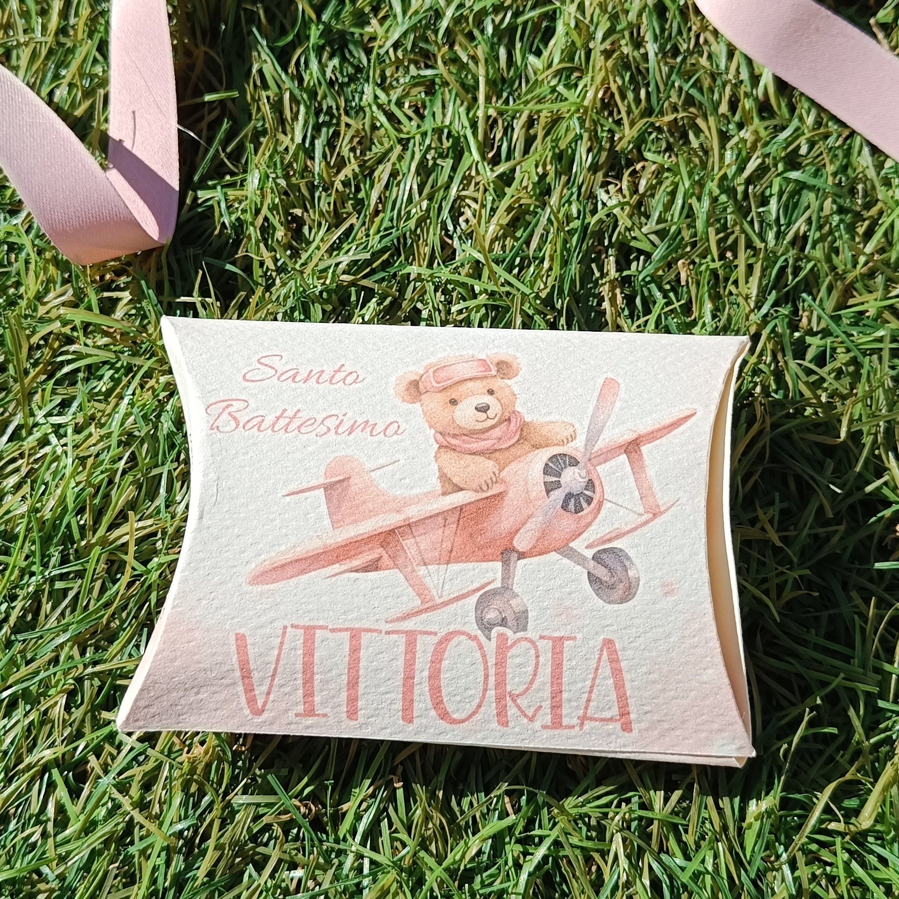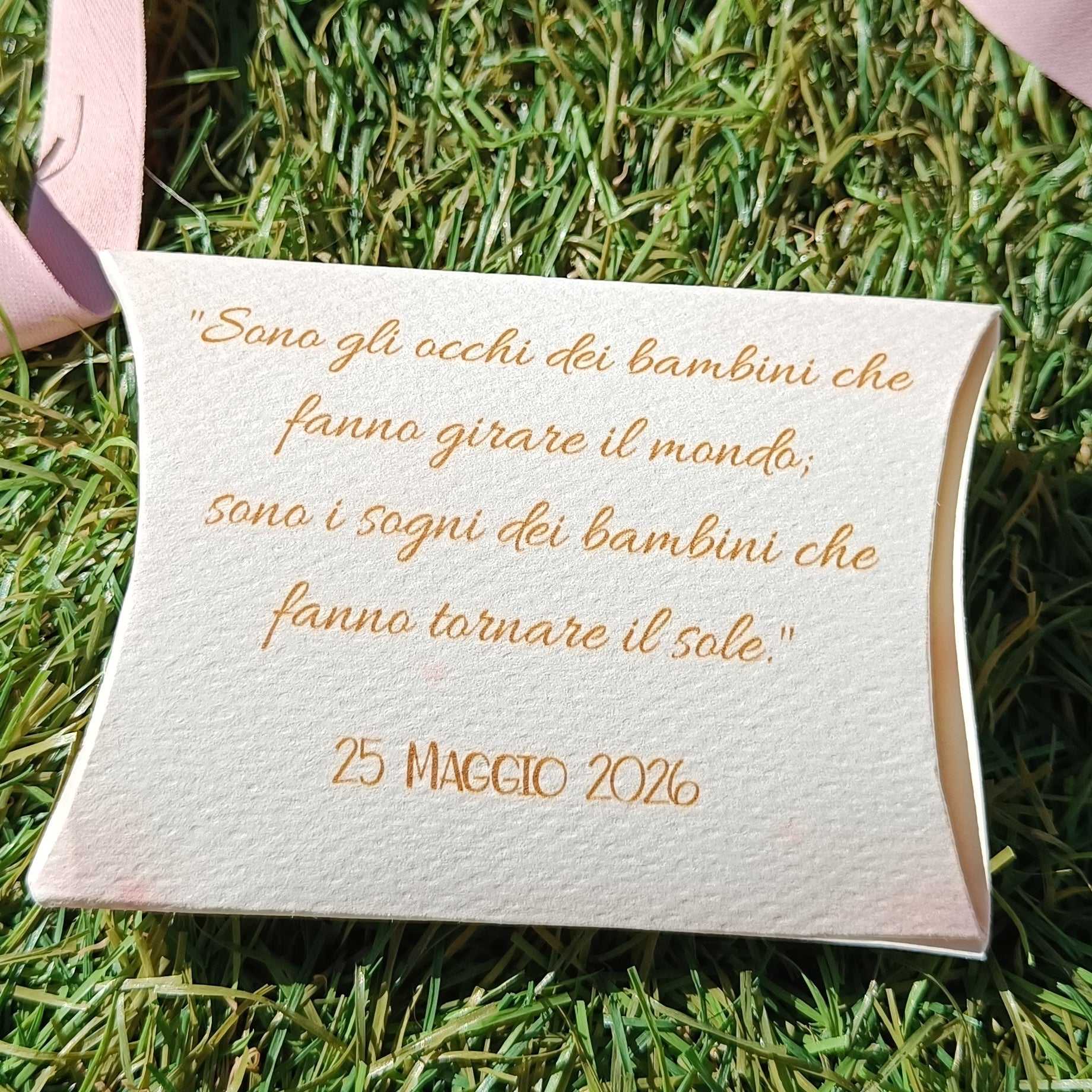 La scatolina cuscino con confetti è un'idea elegante e originale per celebrare momenti speciali. Con la sua forma morbida e avvolgente a cuscino, questa scatolina aggiunge un tocco di raffinatezza a nascita, battesimi, comunioni, matrimoni e altri eventi. Realizzata a mano in cartoncino, può essere personalizzata con la grafica che più si addice al tema scelto per il vostro evento ed eventuali nastrini e/o tag, per un effetto unico e sofisticato. Al suo interno, troverete confetti a scelta tra mandorla o cioccolato.